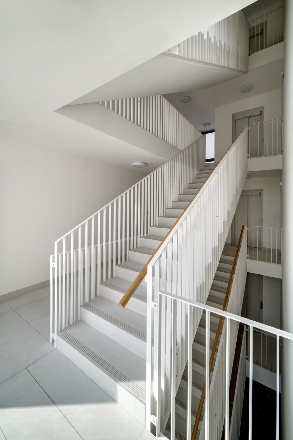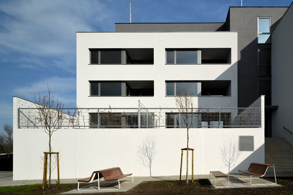 Soubor s 53 byty je rozdělený do tří hmot, společně s předzahrádkami spodních bytů a s ustupujícím horním podlažím vytváří kompozici rozloženou po výrazné terénní depresi.