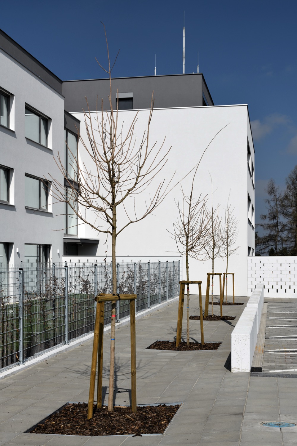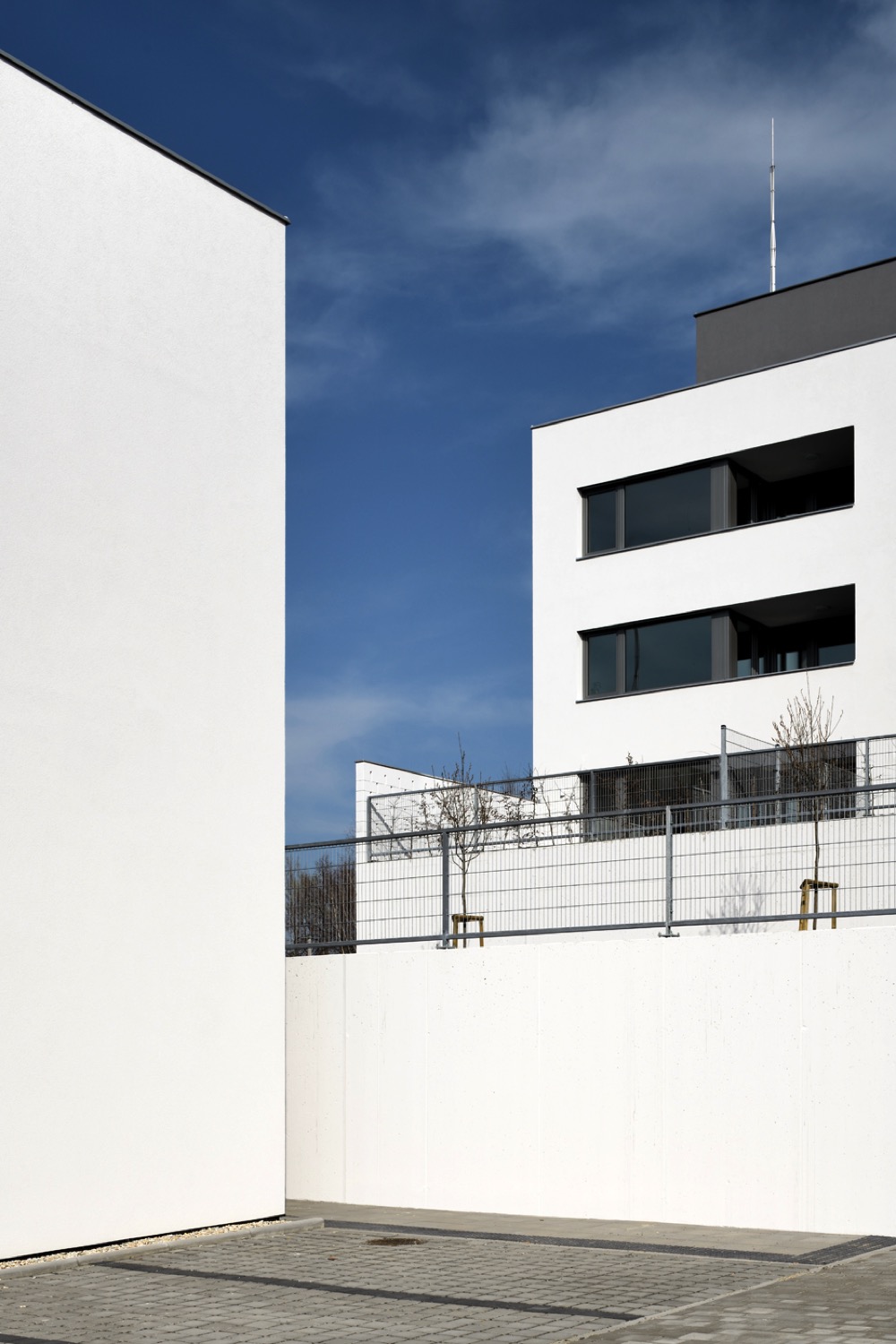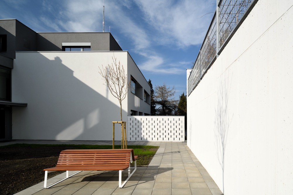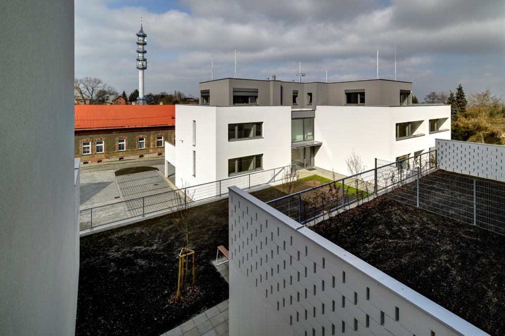 V těžišti obytného souboru je navržený polouzavřený komunitní dvůr pro vytváření sousedských vazeb. Soukromé prostory tvoří předzahrádky spodních bytů a střešní terasy bytů horních.