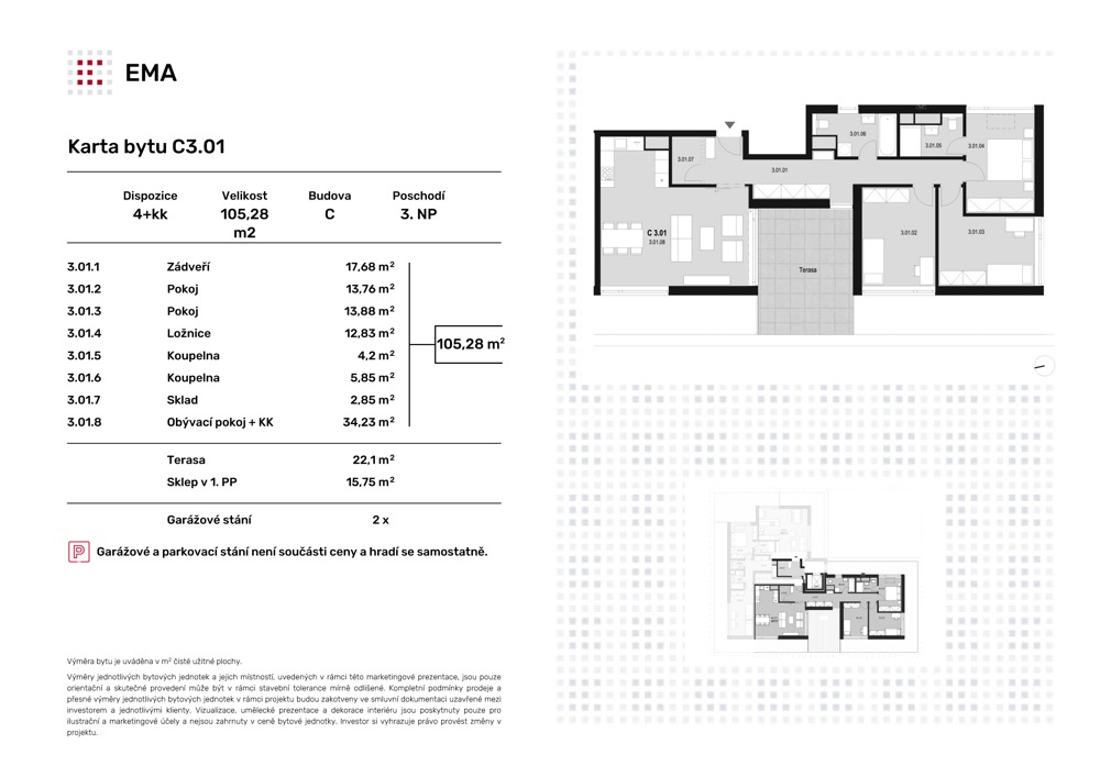 V posledním podlaží jsou umístěny byty 4+kk se střešními terasami.