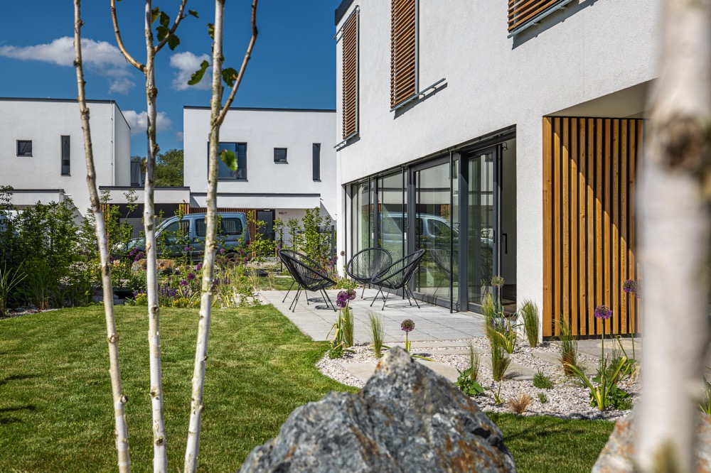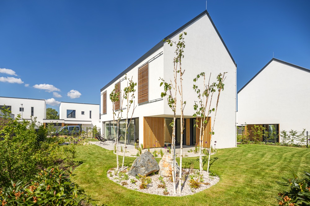 Jaké obnovitelné zdroje se využívají?: Hlavními obnovitelnými zdroji je teplo ze vzduchu. Projekt disponuje retenčním systémem pro zachytávání a využívání dešťové vody k zavlažování zahrad a údržbě okolí. Kvalitu vnitřního prostředí zajišťuje řízené větrání s rekuperací, automatické stínění, kvalitní tepelná izolace a zónová regulace vytápění. Výsledkem je stabilní teplota, optimální vlhkost a nízká koncentrace CO₂ bez nutnosti intenzivního větrání.