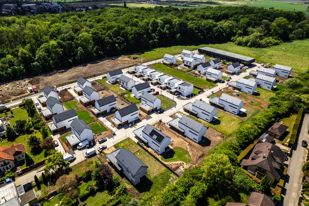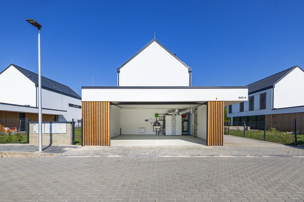 Popis technických systémů z hlediska jejich efektivního provozu (vytápění, chlazení, větrání, vlhčení, osvětlení): Každý dům je vybaven tepelným čerpadlem vzduch–voda pro vytápění, chlazení a ohřev vody. Rekuperační jednotka zajišťuje stabilní vnitřní klima s úsporou tepla až 90 %. Podlahové vytápění zajišťuje rovnoměrnou teplotu, senzory, CO₂ regulují kvalitu vzduchu a systém optimalizuje provozní režimy podle denní doby. Díky tomu se výrazně snižují provozní náklady i energetické ztráty.