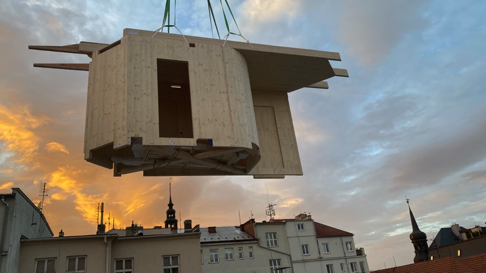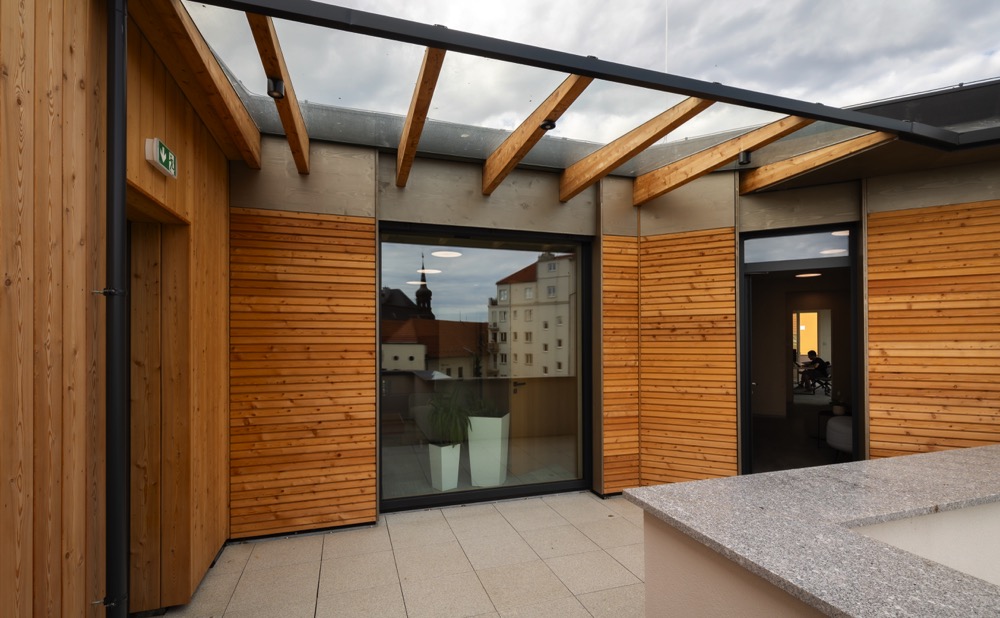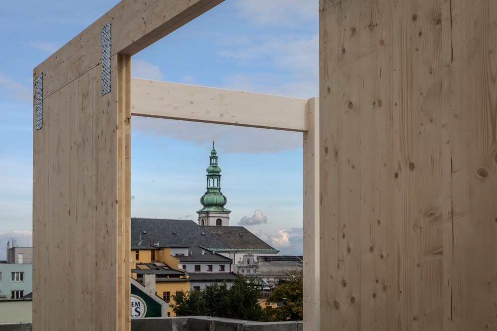 První dřevěná nástavba z CLT panelů v historickém centru města Opavy. Prostory byly vybudována na střeše domu z roku 1929, který byl pravděpodobně již ve 30. letech minulého století koncipován tak, aby jednou mohlo dojít k rozšíření. Vlivem historických událostí, kdy na židovskou rodinu majitelů tvrdě dopadly nacistické perzekuce a následně i nepřátelství komunistického režimu, byla nástavba realizována až se stoletým zpožděním. Postavit ji nechal vnuk původního majitele.