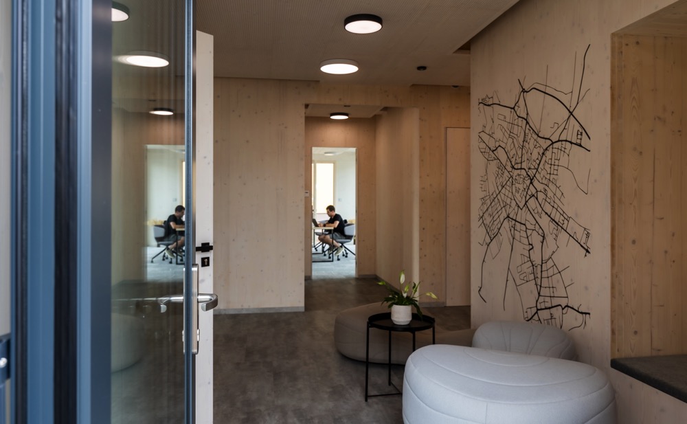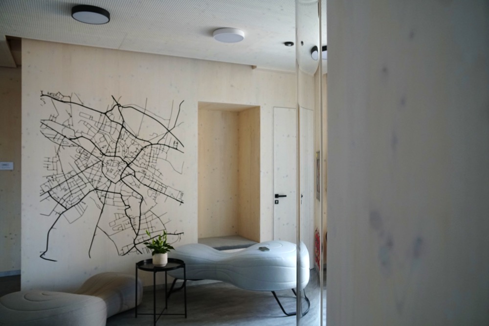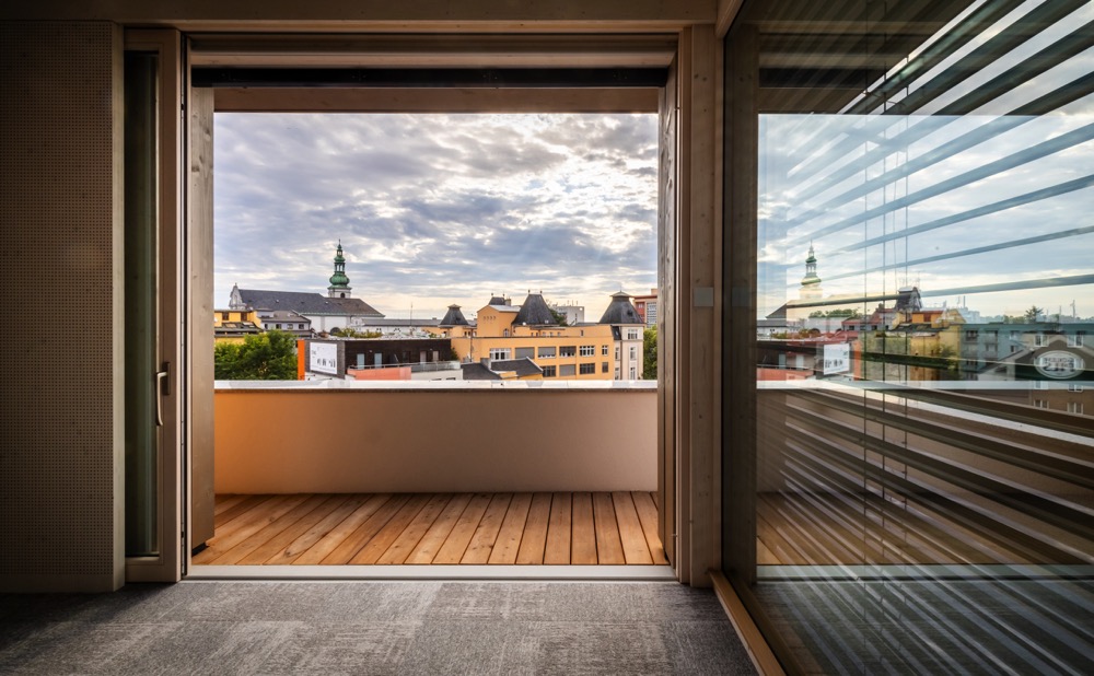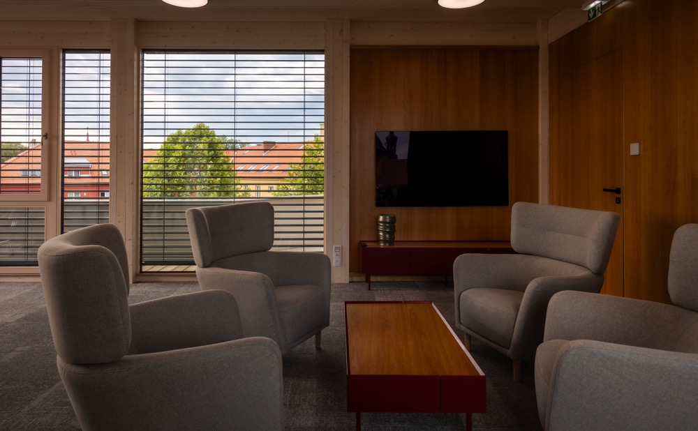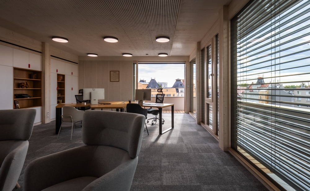 Technologické inovace (vybavení a standard pronajímaných ploch): Systém LOXONE s pokročilým nastavením, pohledové dřevo v interiérech, vysoký standard vybavení dokončený ve spolupráci s nájemníky – ze strany majitelů objektu jsou samozřejmostí například akustické panely s masivního dřeva.