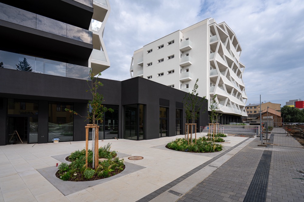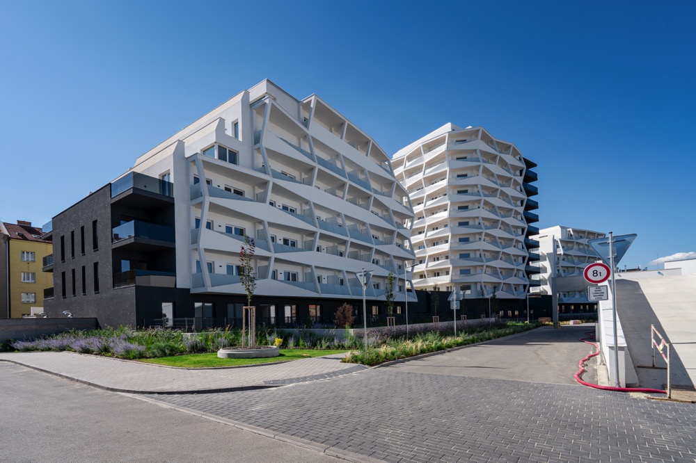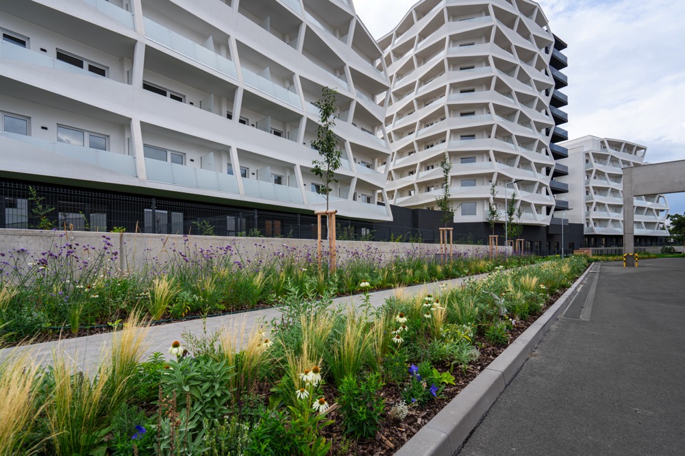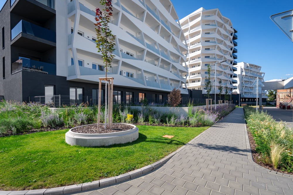 Použité environmentální technologie v projektu, které snižují dopad budovy/projektu na životní prostředí: Všechny objekty mají extenzivní zelené střechy (nejvyšší podlaží), střešní terasy mezi objekty mají intenzivní ozelenění (střešní zahrady). Část objektu je zcela pod terénem mimo nadzemní části (podzemní podlaží) a je zde opět použito intenzivní ozelenění (soukromé zahrady i veřejný prostor).