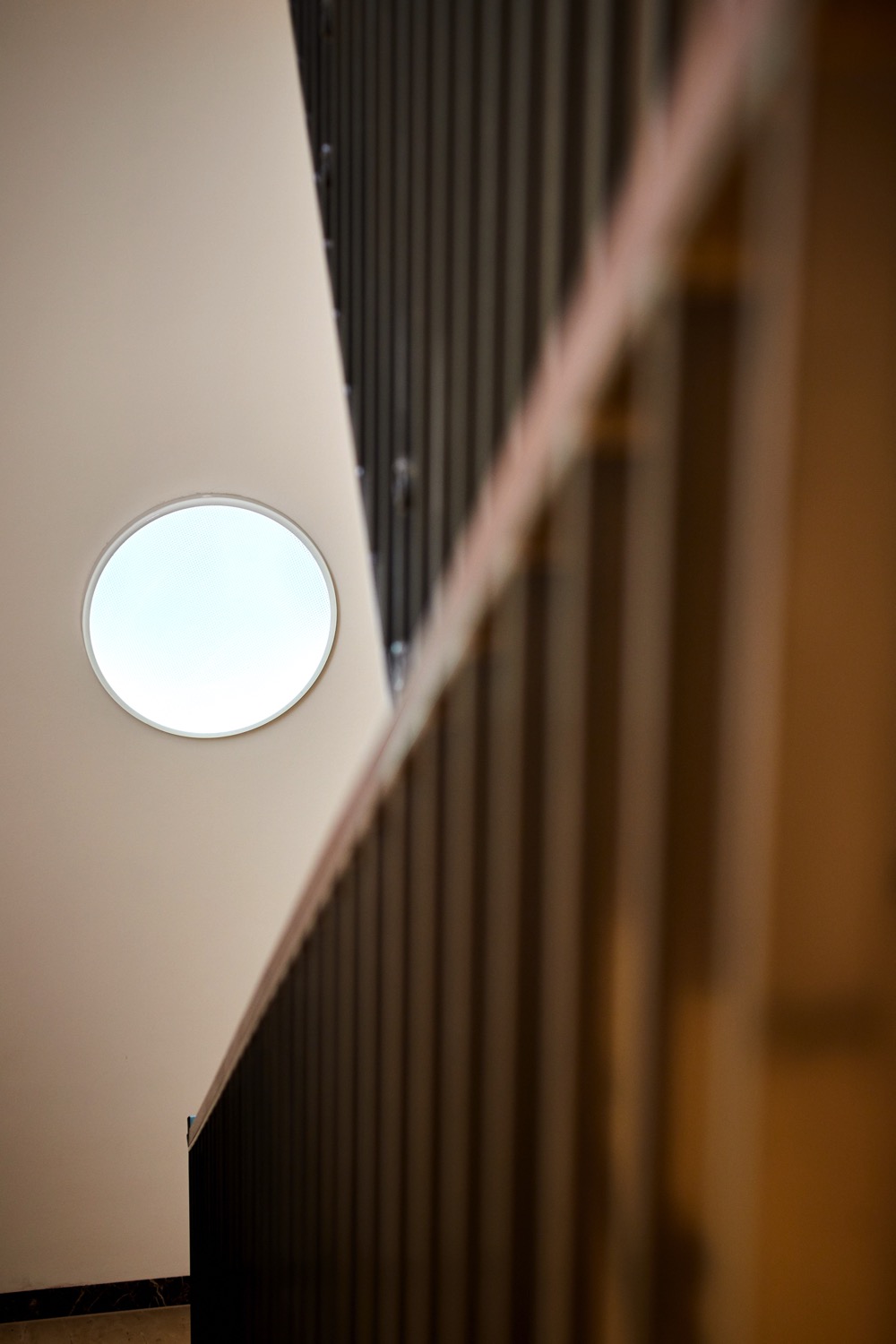 Na fasádě jsou použita hliníkovými okna (Ral 7022). Zaskleno je izolačním trojsklem. Na jižní fasádě (do dvora) jsou provedeny pro stínění předokenní žaluzie, a použity jsou také integrované plyssé sítě proti hmyzu. Okna jsou řešena jako kombinace posuvů – HS portál a otevíravých částí.