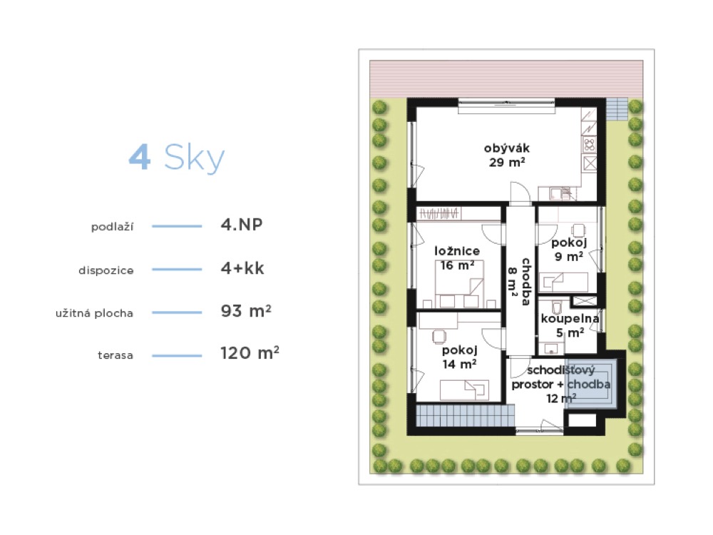 Celková plocha balkonů, teras, zahrádek: 710 m²