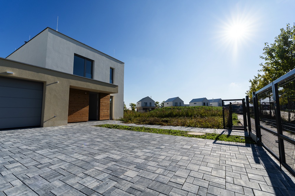 Zahrady velké až 1 124 m² jsou dost prostorné na to, aby se na ně vešel bazén, venkovní posezení, dětský hrací koutek i ovocné stromy. Parkovací stání pro další dva automobily oceníte, když nebude chtít zajíždět do garáže nebo za vámi přijede návštěva.